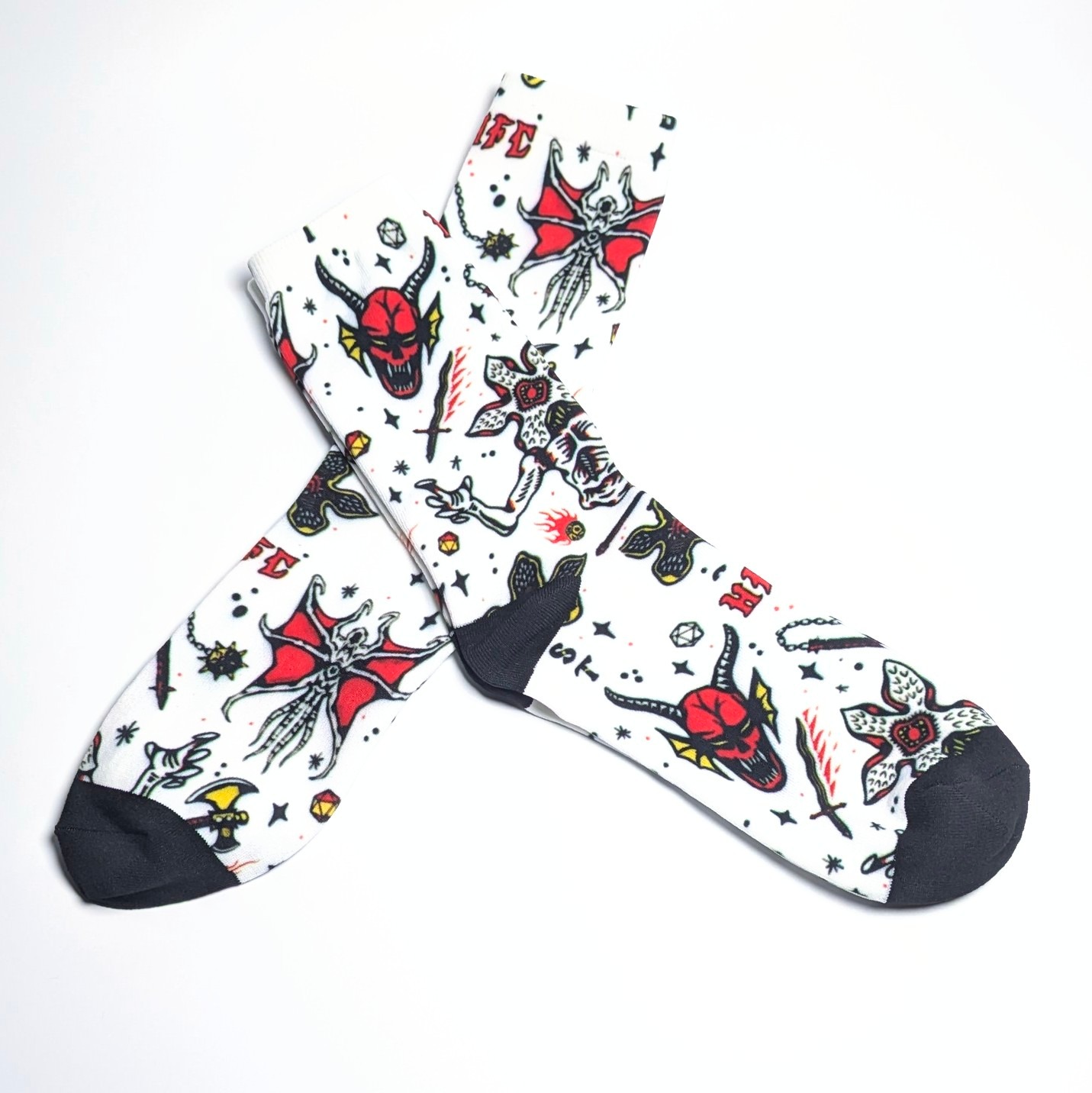 デモゴルゴン、ヘルファイアのロゴが散りばめられたPOPなデザインで、SIZEもユニセックスなのでカップルで履いても最高に可愛い🧦🫶